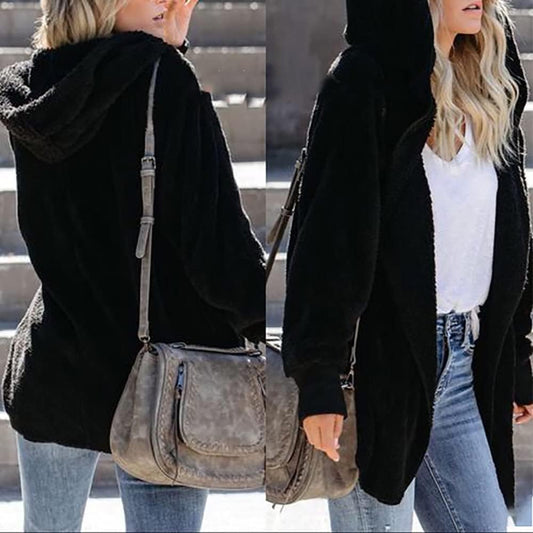 Womens Fuzzy Jacket Hooded Cardigan Open Front Sherpa Coat Outwear with Pockets