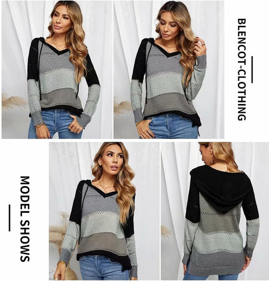 Women Color Block Hooded Crochet Striped Sweaters Lightweight Drawstring Hoodies Pullover Trendy Sweatshirts